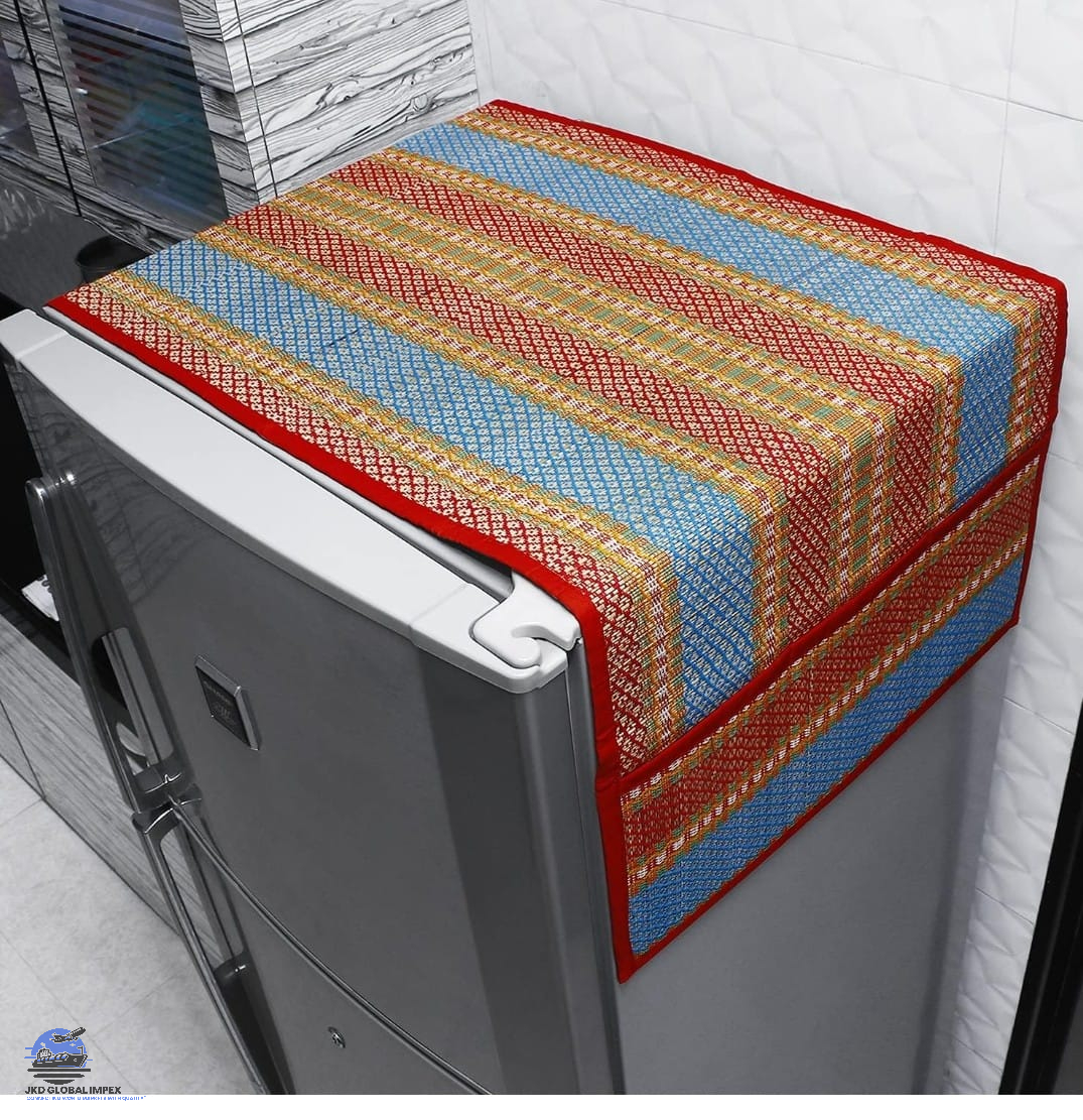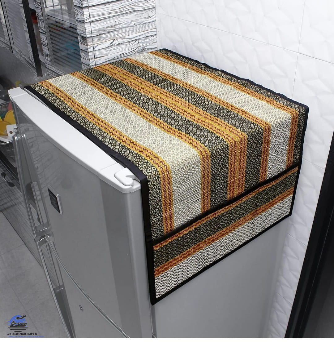 Bring an eco-friendly touch to your kitchen with this beautifully handcrafted fridge cover made from Madur Kathi, a traditional natural grass known for its durability and sustainability. Designed with vibrant green, beige, and earthy tones, this cover not only protects your refrigerator from dust and stains but also adds a rustic charm to your space. It features convenient side pockets to hold kitchen essentials like scissors, napkins, pens, bills, and more — blending style with functionality.