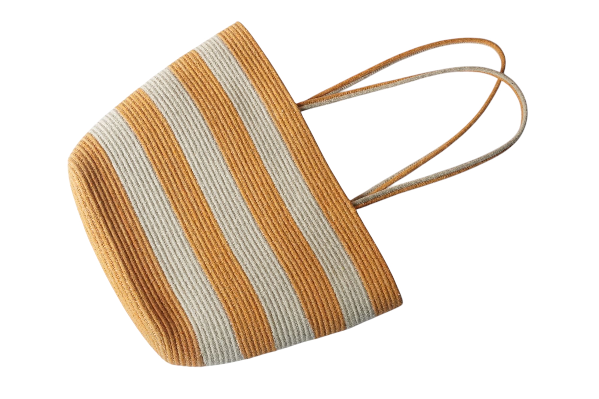 Featuring a beautiful blend of beige, mustard yellow, and deep brown bands, this spacious tote is ideal for casual outings, market runs, beach days, or as a stylish storage accessory. The twin long handles ensure comfortable shoulder carrying, while the wooden button closure adds a rustic, handcrafted touch.