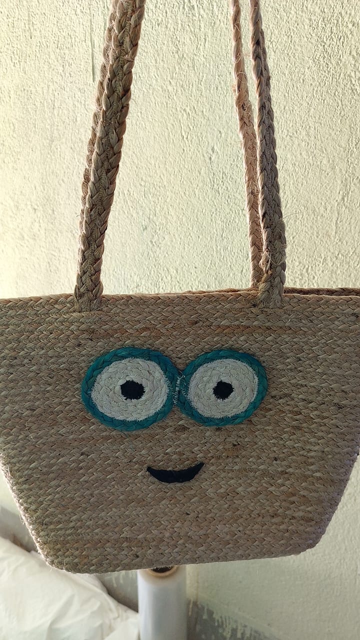 Add a touch of fun and eco-conscious fashion to your day with our handcrafted jute bag, creatively designed with a charming cartoon face! Made from high-quality natural jute rope, this bag features a cheerful expression with hand-braided details, including round glasses and a cute smile that’s sure to make you stand out.